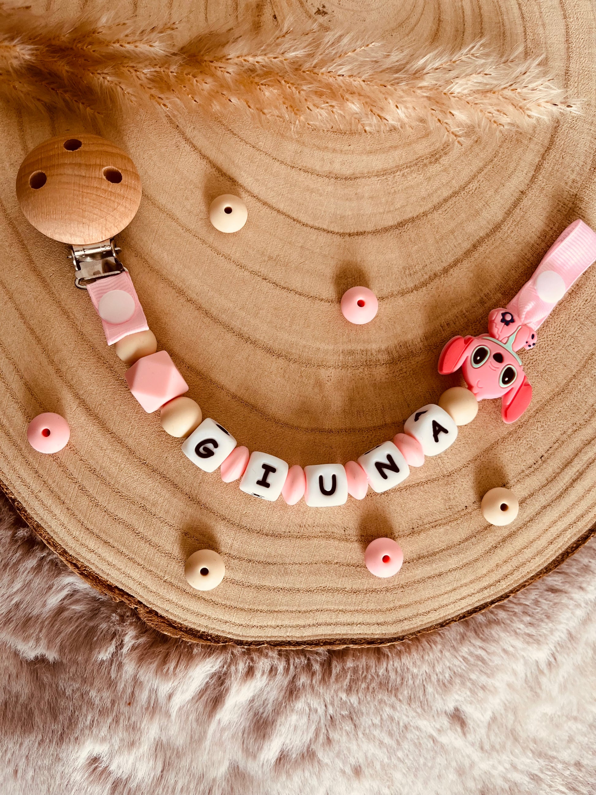 Descubra nuestra magnífica Pinza para chupete personalizada de Stitch en color rosaDiseñado especialmente para Giulia, pero puedes elegir el nombre que prefieras. Este exclusivo clip para chupete incluye una perla de silicona de grado alimenticio con forma de Stitch y un clip de madera.