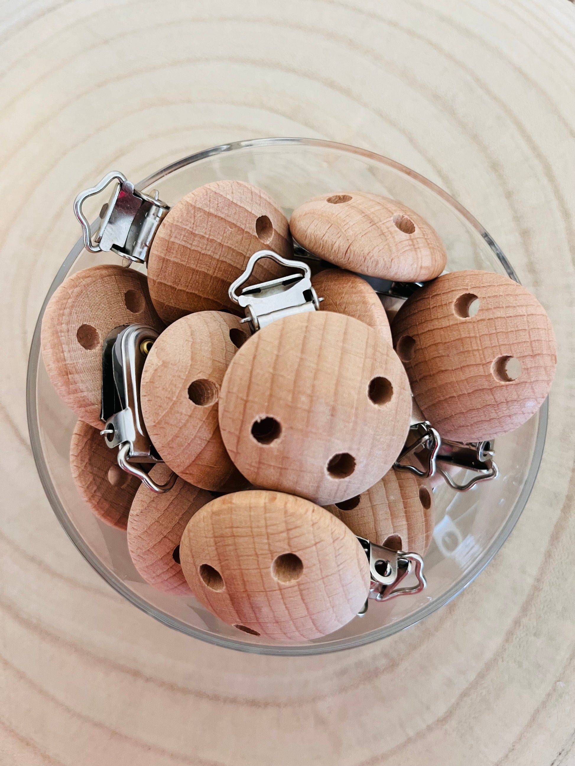 Clip en bois de hêtre brut, naturel, sans vernis avec fixation en acier