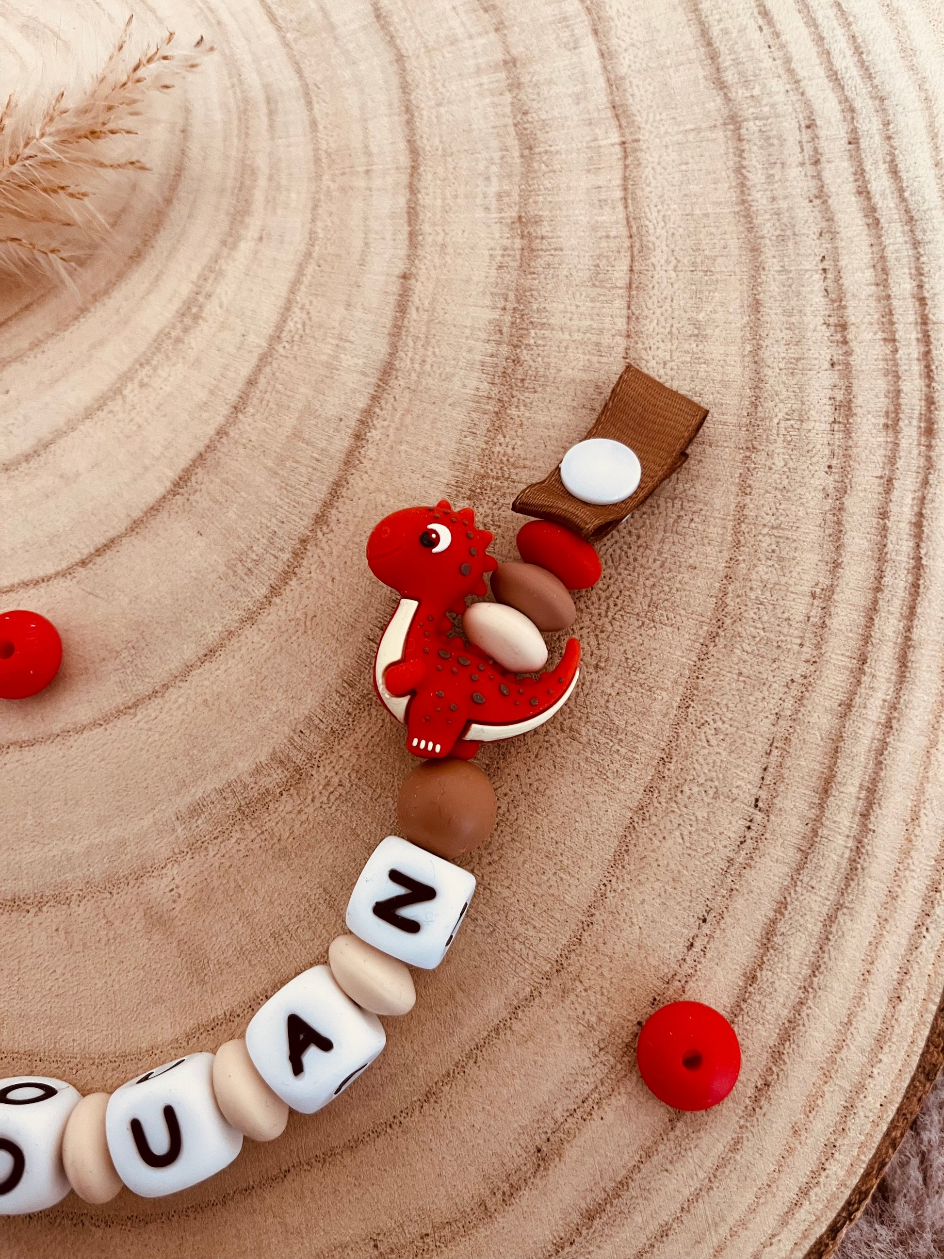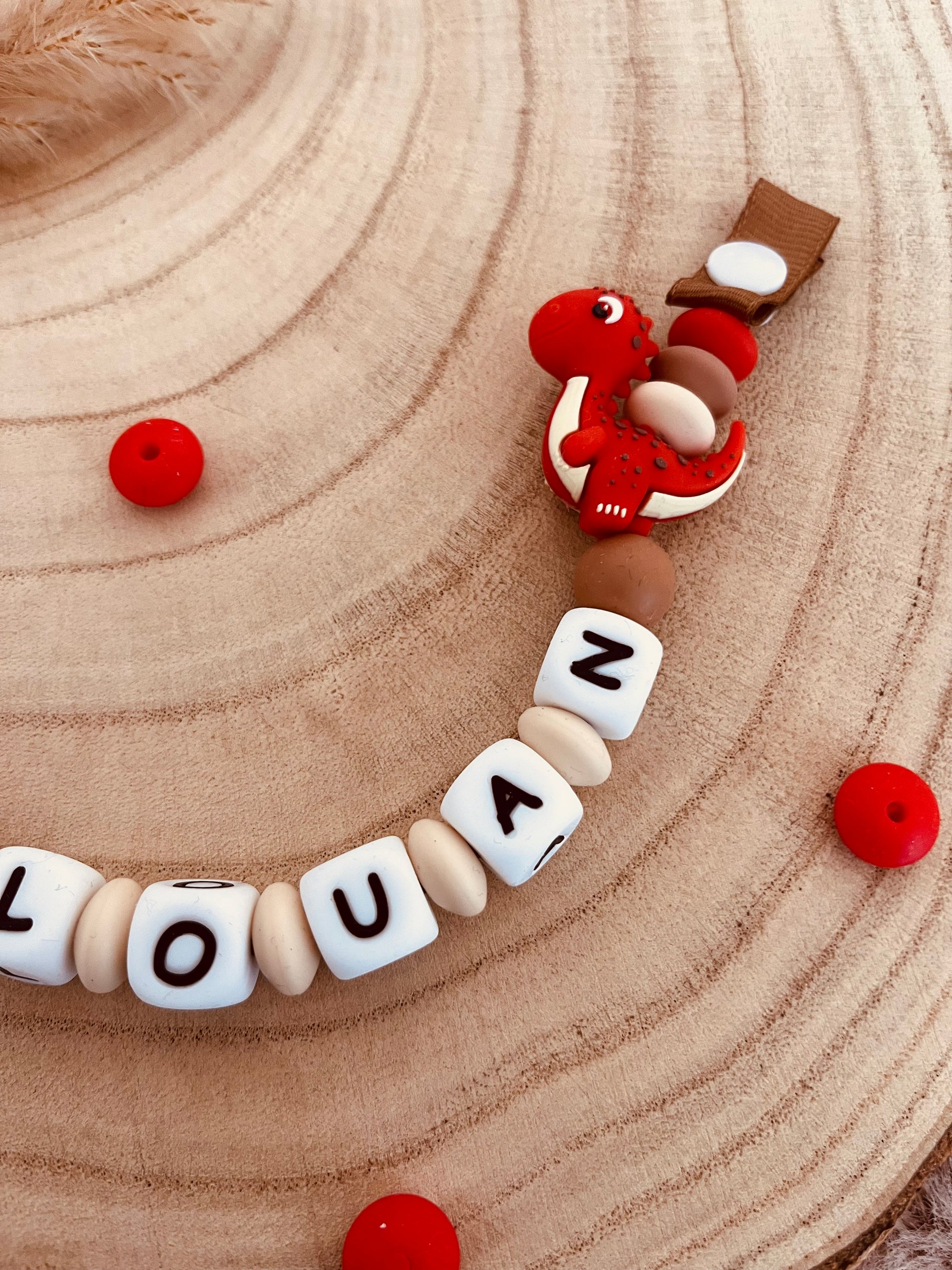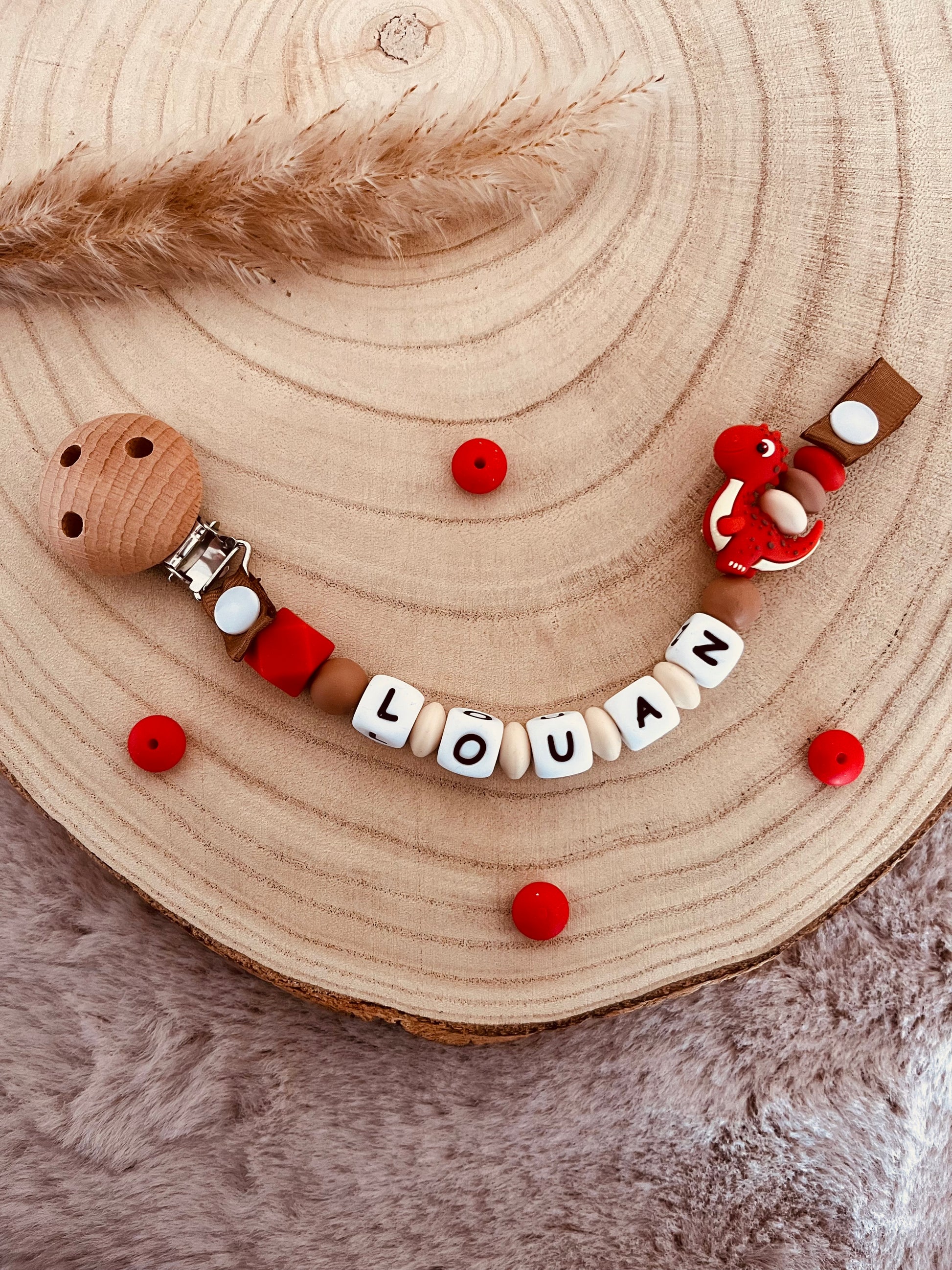 Découvrez cette attache-tétine en silicone alimentaire, composée de perles beiges et marron, avec un adorable petit dinosaure 3D rouge qui séduira bébé dès le premier regard. Personnalisable avec le prénom de bébé, elle allie praticité, sécurité et style ludique, parfaite pour garder la tétine toujours à portée de main. Une attache-tétine silicone personnalisée bébé tendance et originale, idéale comme cadeau de naissance unique et sûr.