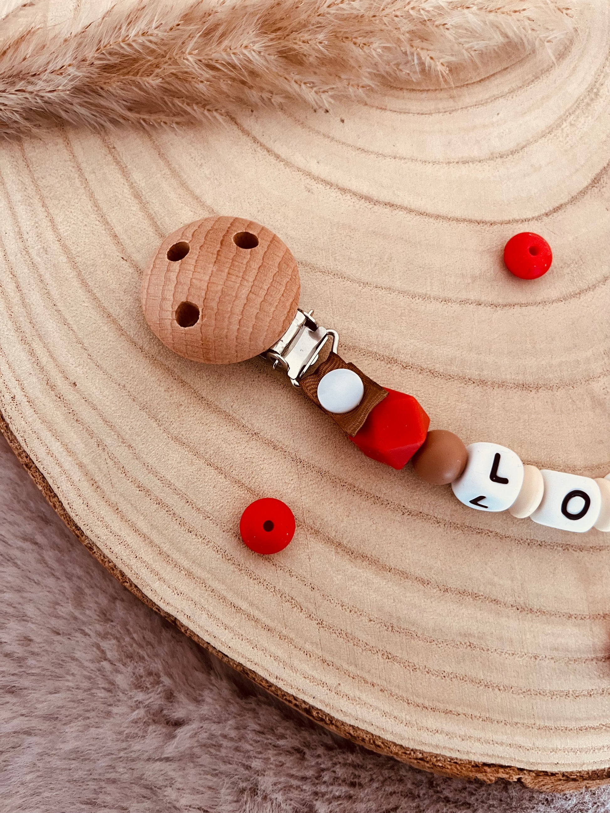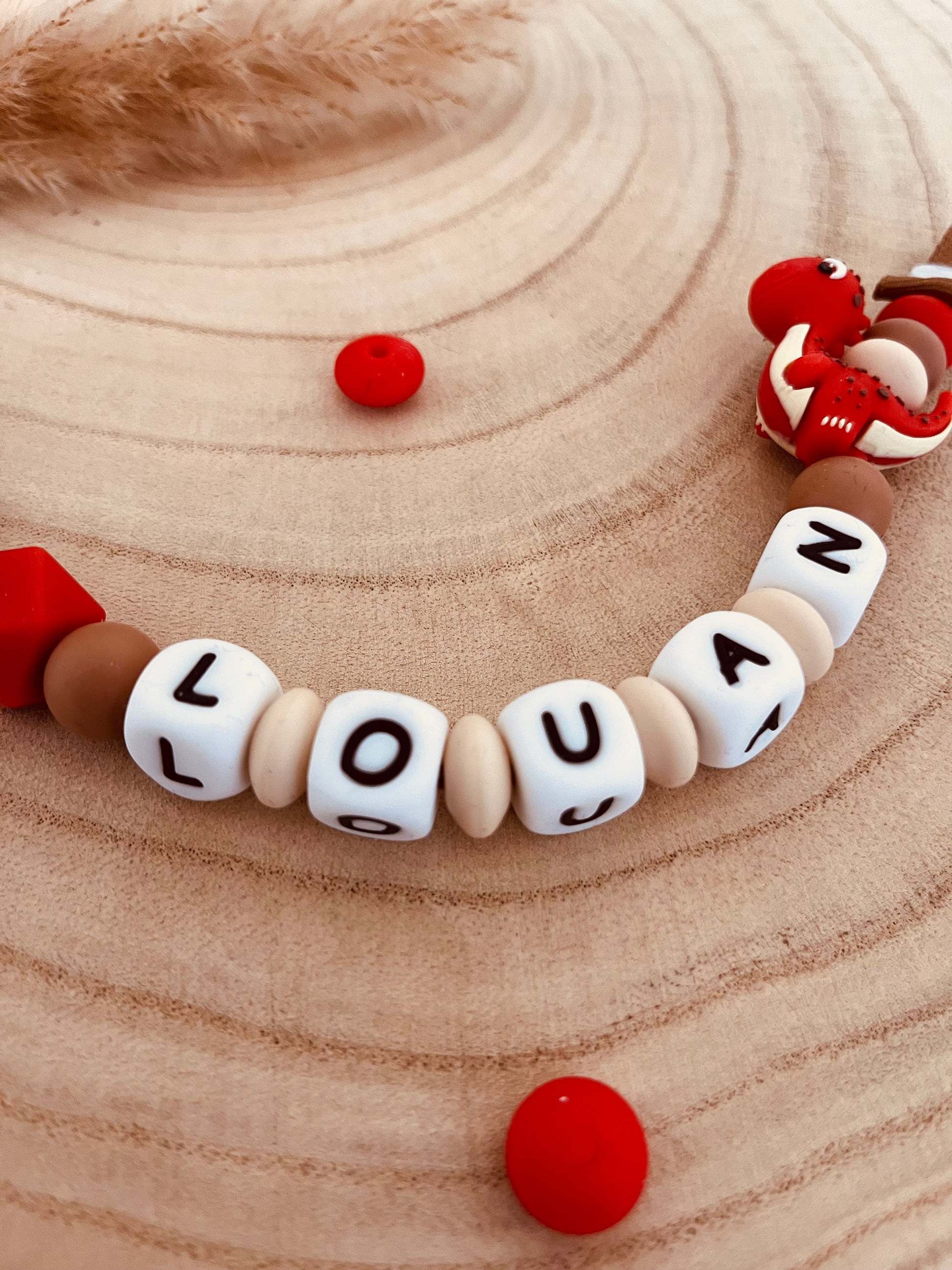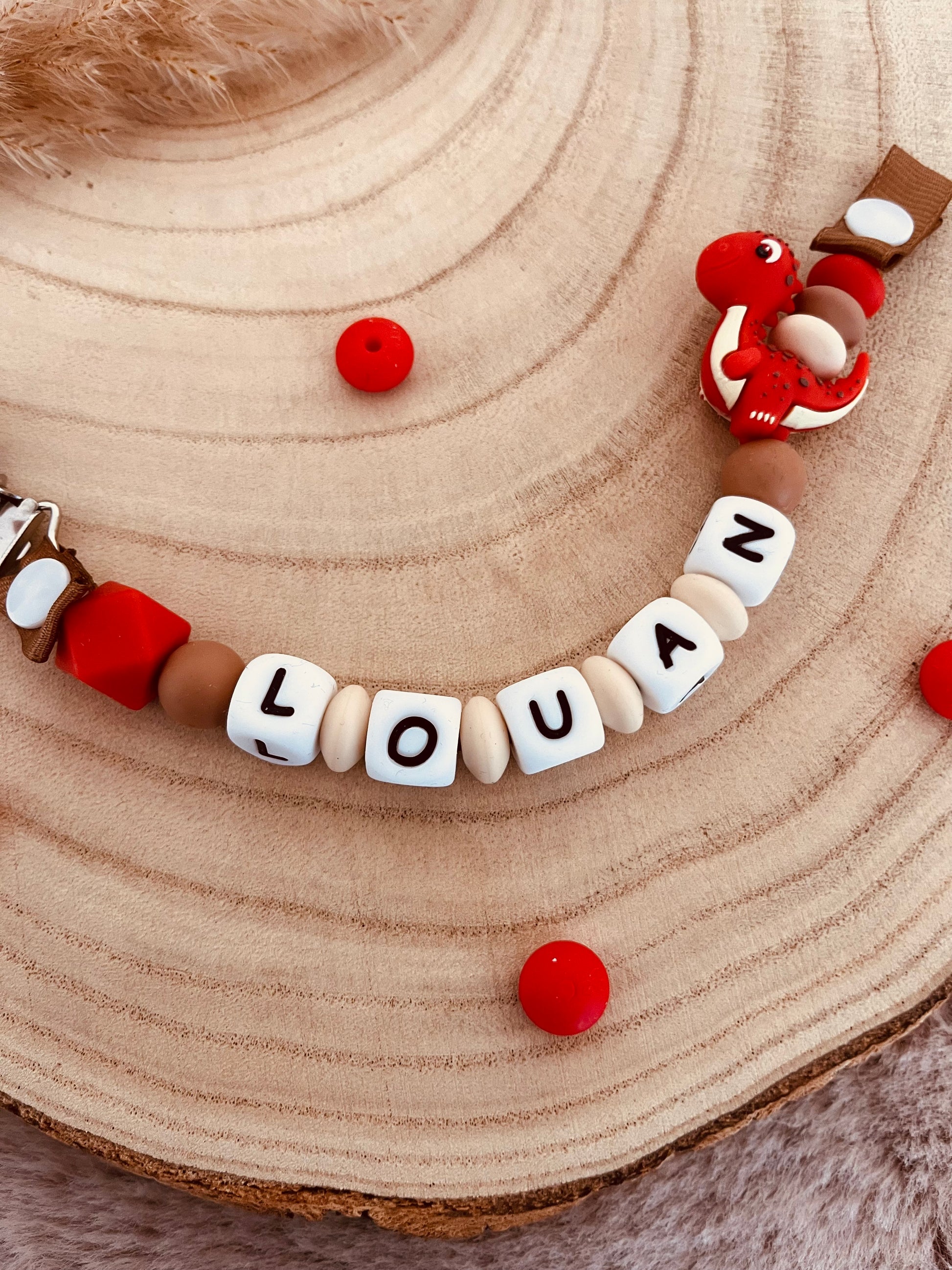 Découvrez cette attache-tétine en silicone alimentaire, composée de perles beiges et marron, avec un adorable petit dinosaure 3D rouge qui séduira bébé dès le premier regard. Personnalisable avec le prénom de bébé, elle allie praticité, sécurité et style ludique, parfaite pour garder la tétine toujours à portée de main. Une attache-tétine silicone personnalisée bébé tendance et originale, idéale comme cadeau de naissance unique et sûr.