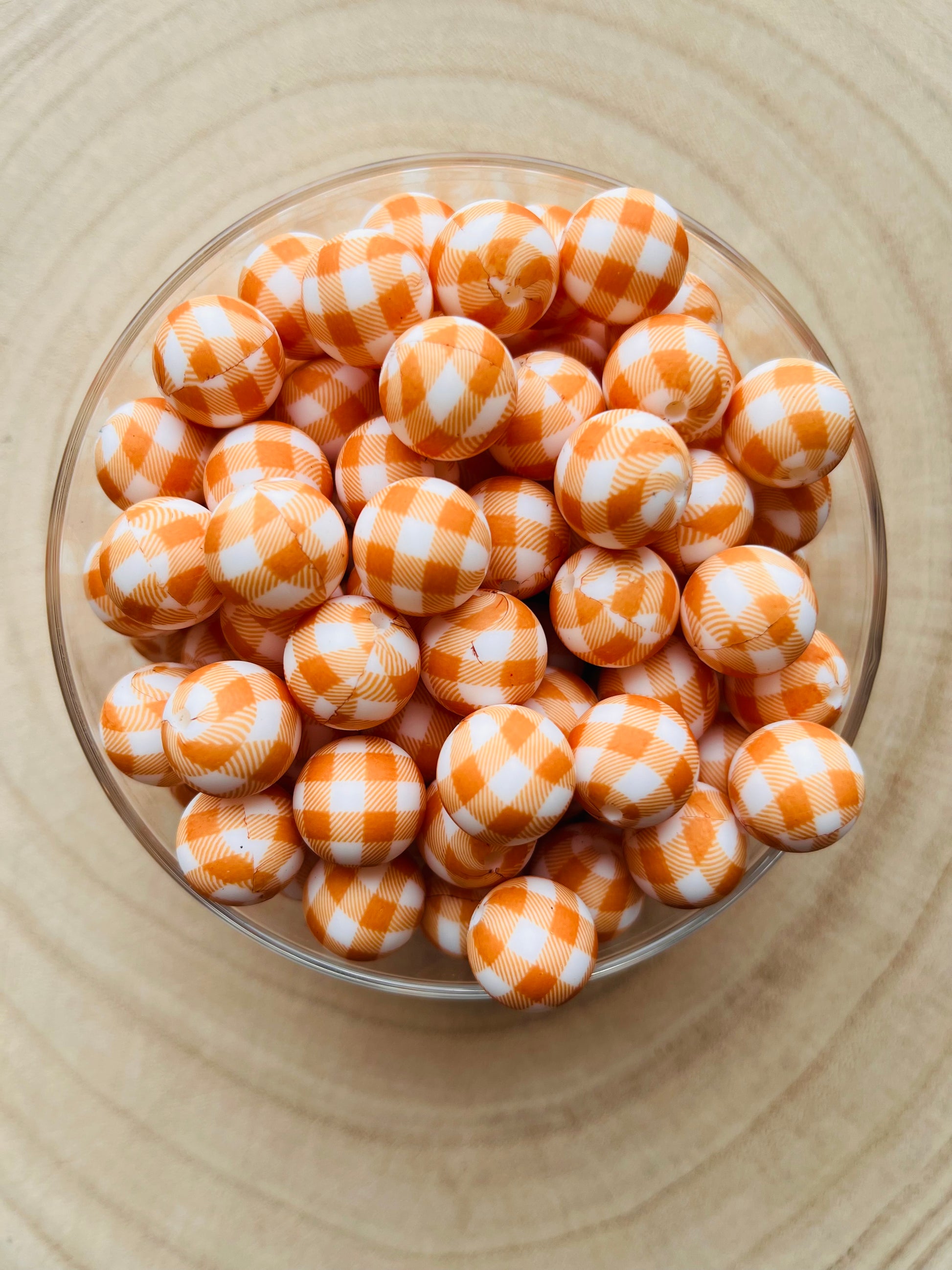 Laissez-vous séduire par la chaleur du style champêtre ! Cette perle en silicone arbore le motif Vichy dans des teintes douces de marron clair (ou noisette) et d'orangé subtil.