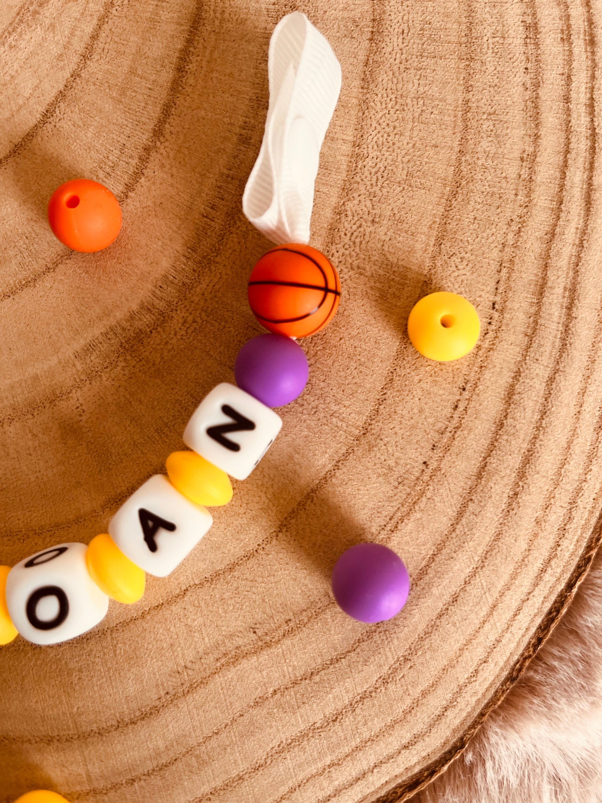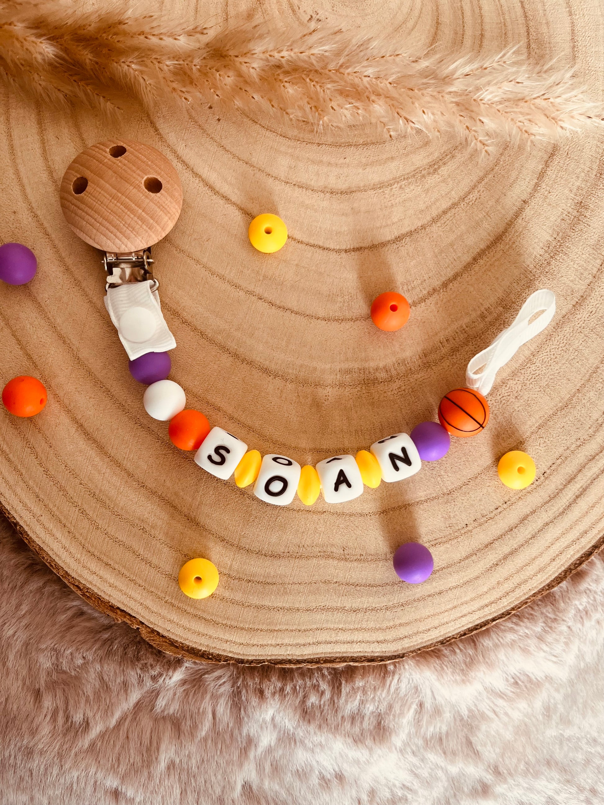 Prendedor de chupeta personalizável com sua conta de basquete de silicone de grau alimentício e seu prendedor de madeira.