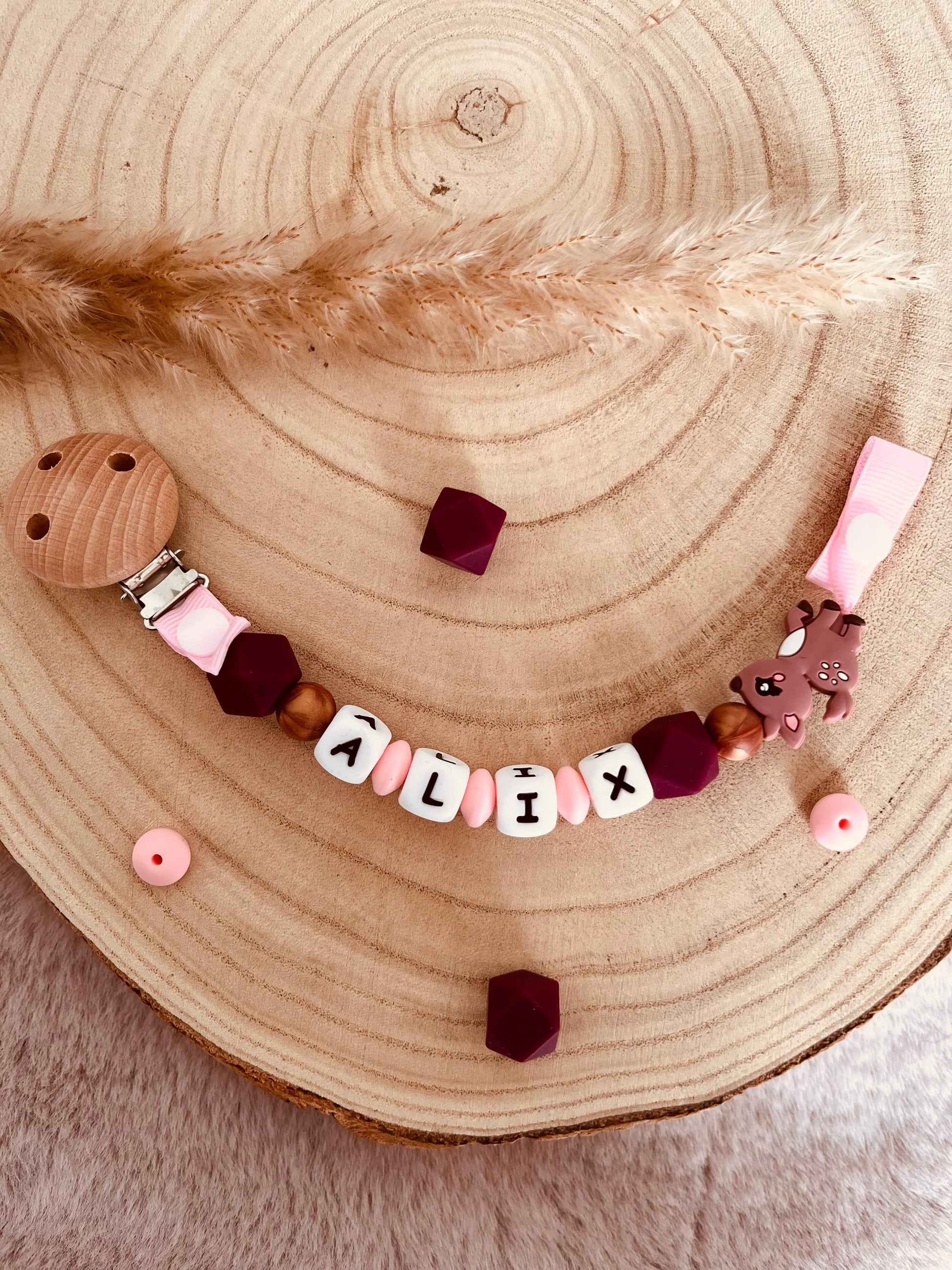 Prendedor de chupeta em formato de corça rosa personalizável com esferas e prendedor de silicone de grau alimentício.
