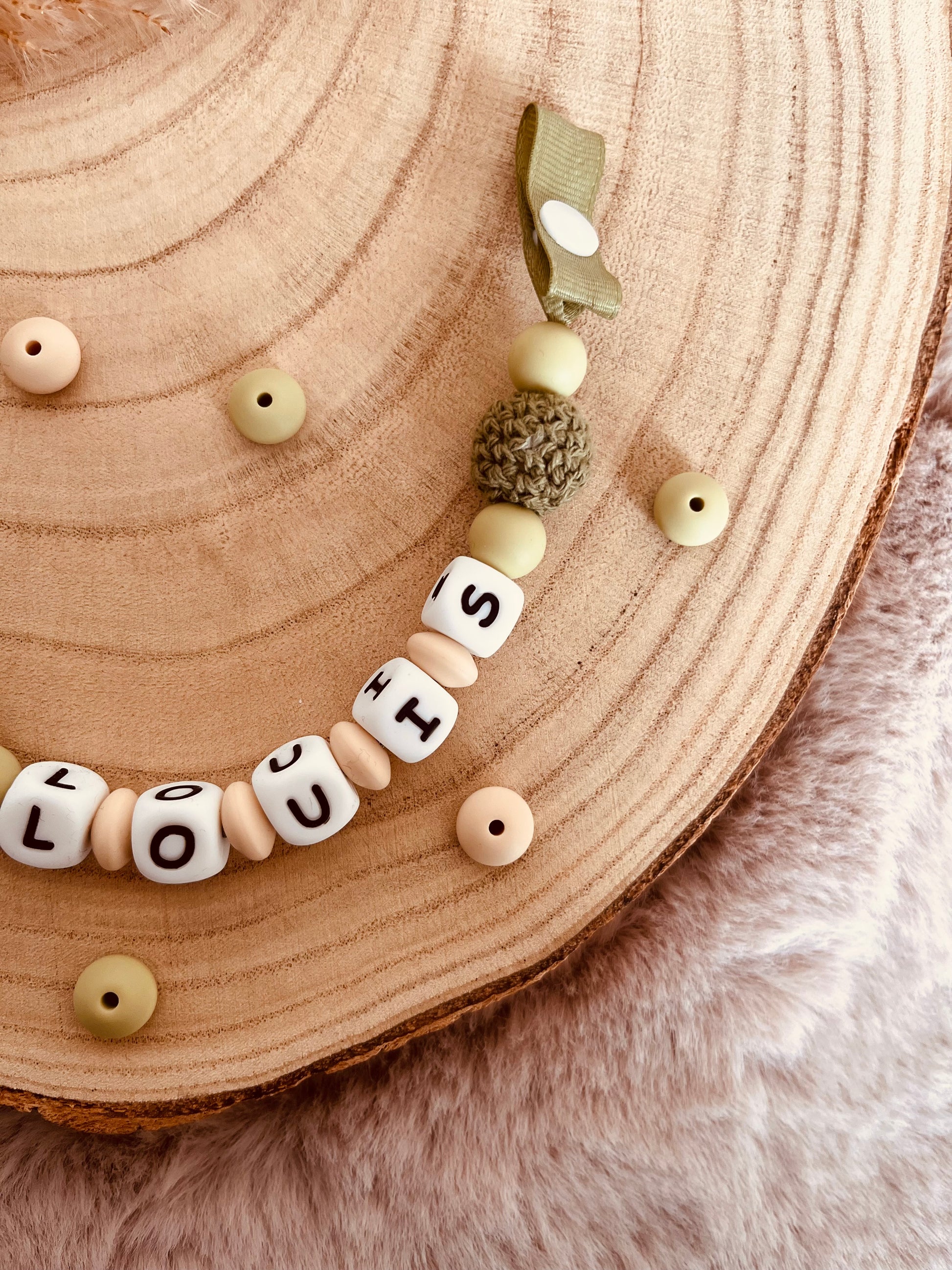 Prendedor de chupeta personalizável com o primeiro nome Louis com suas contas de crochê verdes e seu prendedor de coelho de madeira.